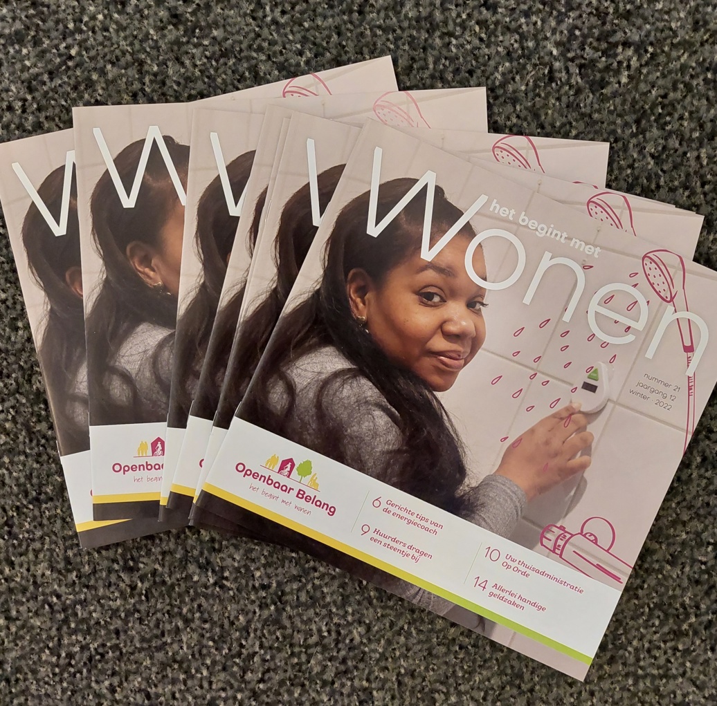 Ieder half jaar, in de zomer en winter, verschijnt het bewonersblad van Openbaar Belang, 'Het begint met wonen'. Een magazine voor huurders met allerlei informatie en leuke artikelen over wonen, in huis en in de buurt.