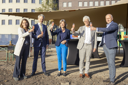 Op de foto van links naar rechts: Maartje de Witte (directeur-bestuurder Openbaar Belang), Jacos van Zelst (directeur Realisatie Woningbouw ministerie van Volkshuisvestiging en Ruimtelijke Ordening), Gerdien Rots (wethouder gemeente Zwolle), Hein Stooker (directeur Projectontwikkeling Trebbe) en Egbert Haas (manager Vastgoed SWZ)