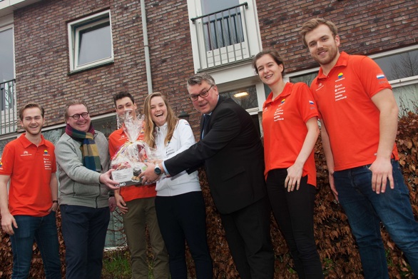 Om de zonneauto te kunnen bouwen, verhuizen 5 studenten voor 3 maanden naar Zwolle. De gemeente Zwolle waardeert dit soort initiatieven en daarom heeft directeur Sjoerd Quint samen met wethouder Anker vanmorgen met veel plezier de studenten op hun eerste ochtend in de woning welkom geheten. Het meegebrachte tosti-apparaat met toebehoren viel bij de studenten in goede aarde.