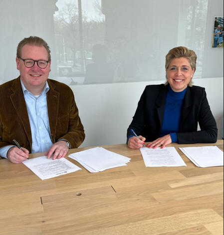 Openbaar Belang blijft inzetten op het verduurzamen van woningen. Voor de 41 appartementen aan de Sabangstraat is Van Wijnen ingeschakeld. Jolanda Comino directeur van Van Wijnen en Sjoerd Quint directeur bestuurder van Openbaar Belang hebben hun handtekeningen onder het contract gezet.