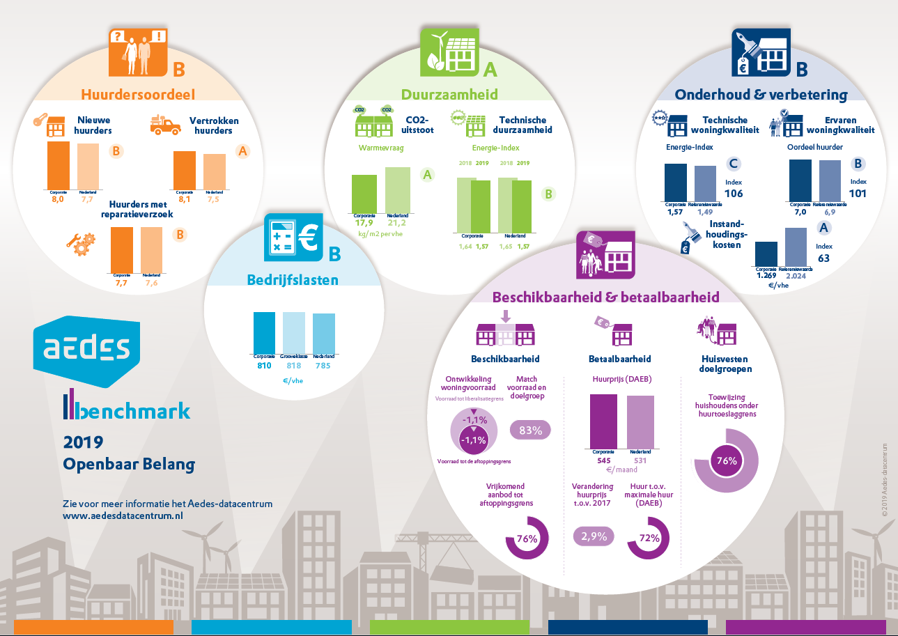 De uitkomsten van de Aedes benchmark zijn bekend. Met een A op duurzaamheid en 3 maal een B op respectievelijk Huurdersoordeel, Bedrijfslasten en Onderhoud & Verbetering scoren wij bovengemiddeld.